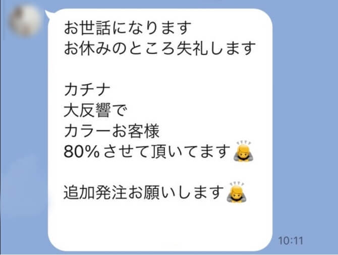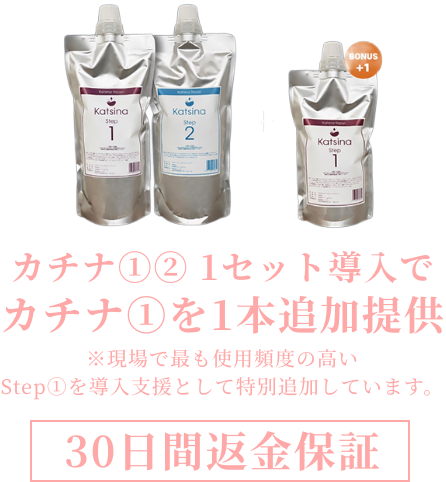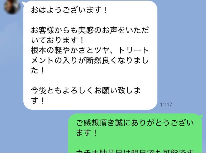 - カラーをする度に頭皮に痒みが出たり、痛みがでるお客様が、一切痒みも痛みもなくなった。・カラー、トリートメントの持ちがすごく良い。・2ヶ月周期のお客様が多いが、カチナ使用後の次の来店時に髪のツヤ感、カラーの持ちがすごく良いのがわかる。・トリートメントの入りが良いので、効果と持ちがすごく良い。