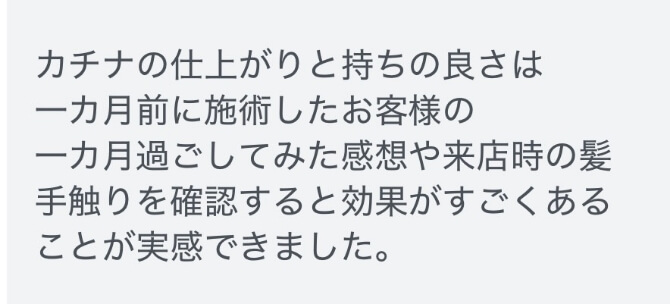 カチナの仕上がりと持ちの良さは、一カ月前に施術したお客様の一カ月過ごしてみた感想や来店時の髪手触りを確認すると効果がすごくあることが実感できました。